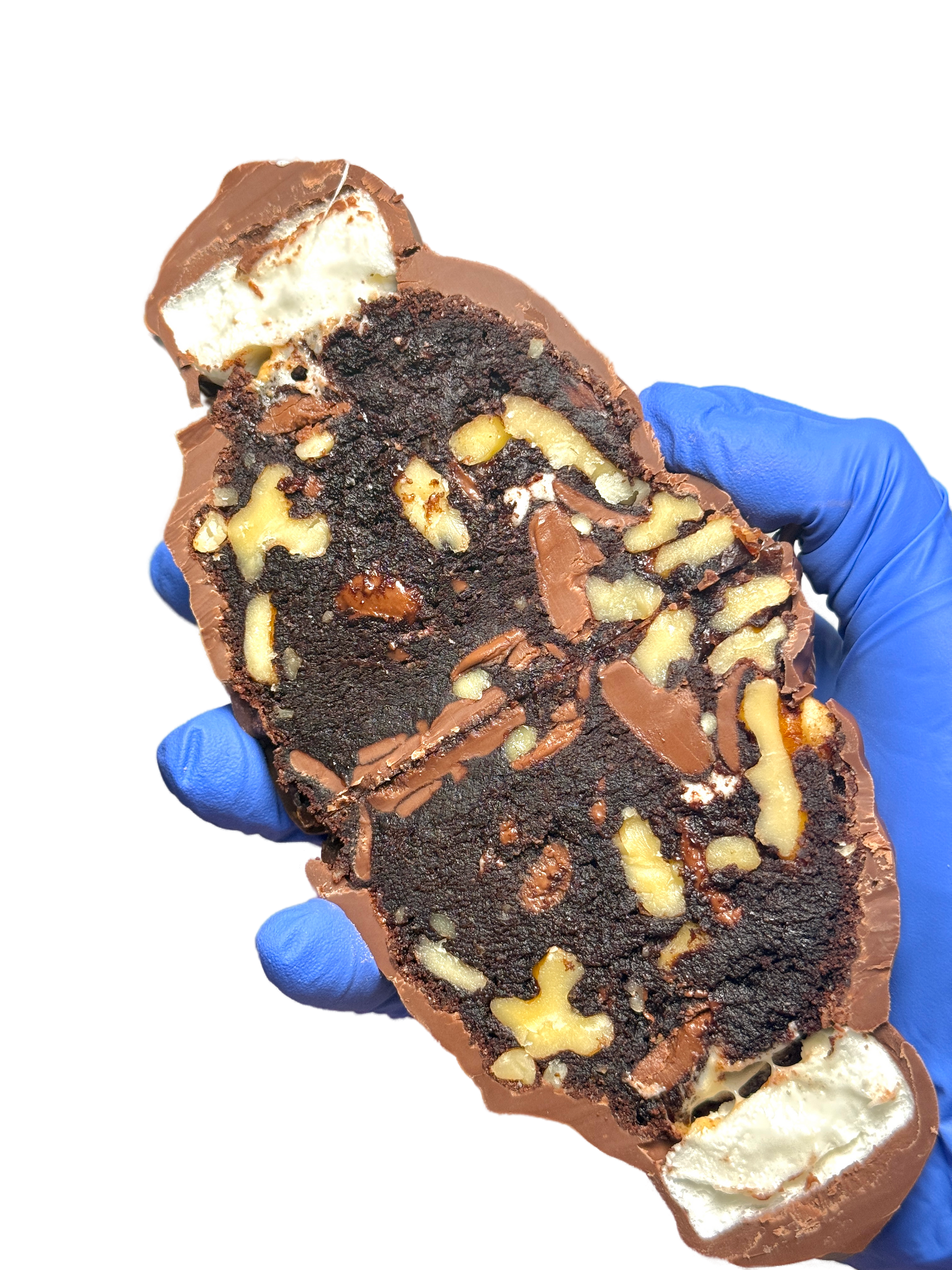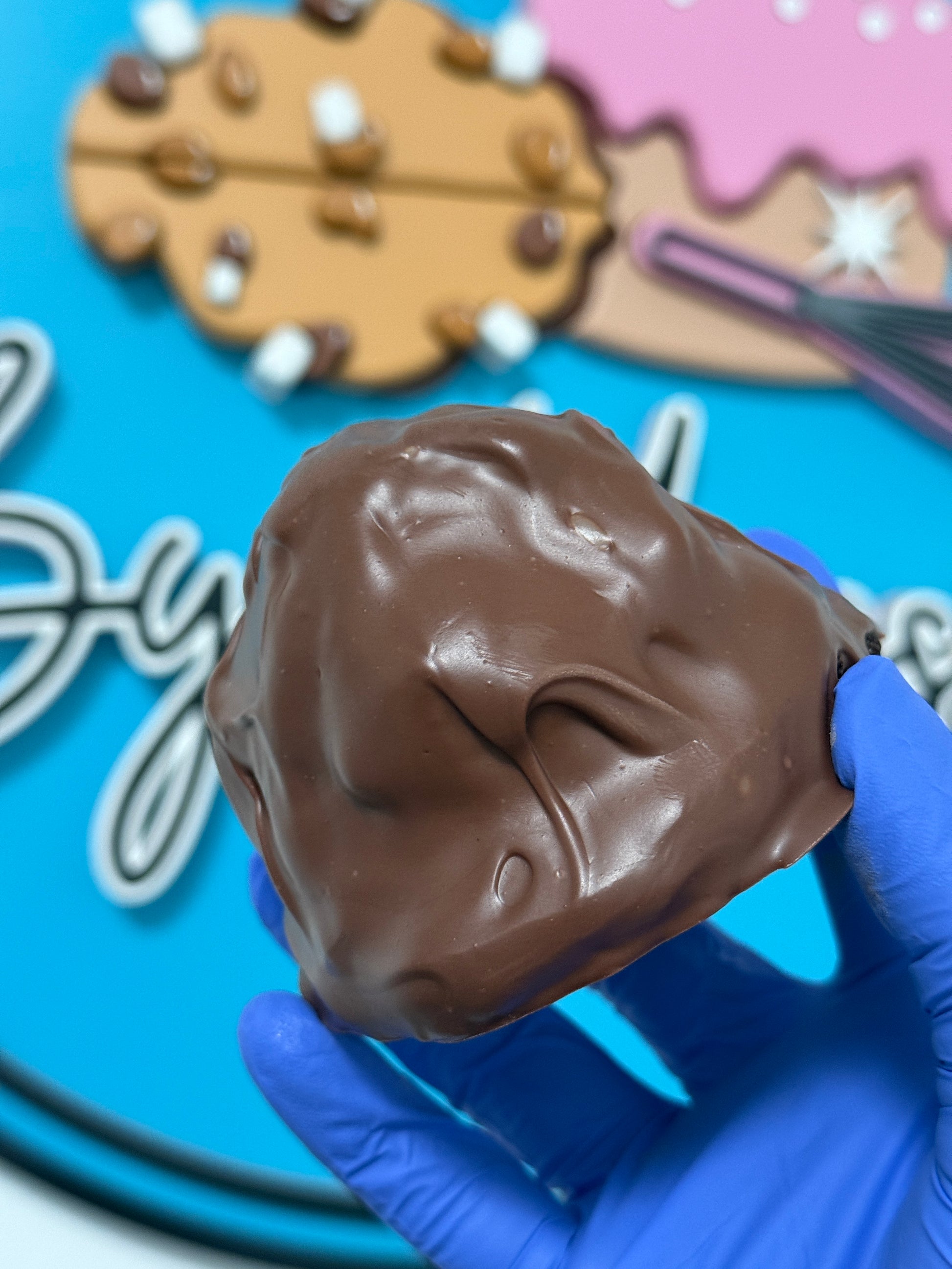 Nuestra Big Fluff Cookie es una explosión de chocolate y textura en cada mordida. Hecha con una masa de doble chocolate cargada de trozos de nuez (walnuts) y pedacitos de marshmallow, coronada con un gran marshmallow bañado en chocolate, Densa, suave y totalmente irresistible — una galleta pensada para los verdaderos amantes del chocolate.